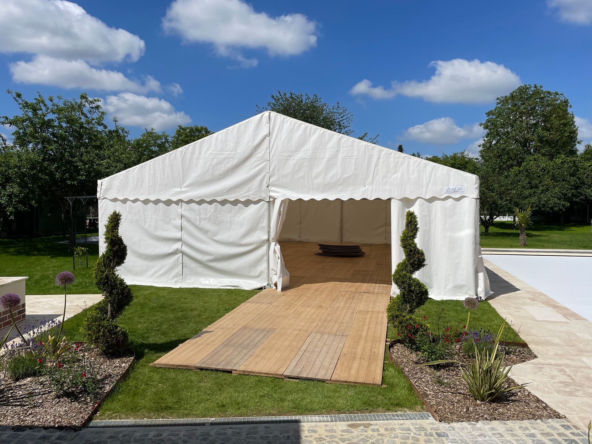 Le chapiteau peut être également agrémenter de parquet, d'éclairage, de chauffage ou de mobiliers.